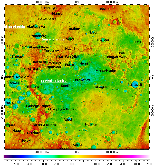The map uses DEM on its background, derived from data of MLA with resolutions from 1000m to 250m over common area.