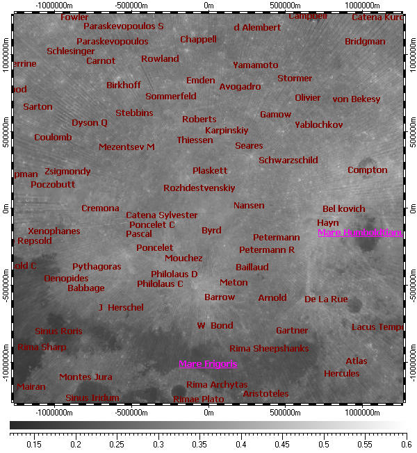 The map uses albedo datum on its background, derived from data of LOLA instrument with resolution 1000m.